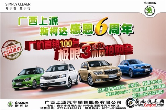 熱烈祝賀廣西首家斯柯達(dá)白金級(jí)經(jīng)銷商“廣西上源斯柯達(dá)4S店”6周年慶。為感謝廣大車主以來(lái)的長(zhǎng)期支持與厚愛(ài)。斯柯達(dá)泉廣西上源4S店6月22日(周六)13:30將在展廳舉行“廠家直銷 極限3小時(shí)”大型搶購(gòu)會(huì),鉅惠到底。報(bào)名熱線:0771-3100011