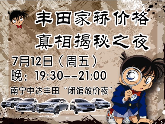 7月12日(周五)晚19:30——21:00,南寧中達(dá)豐田閉館銷售之夜將現(xiàn)場(chǎng)揭秘一汽豐田各款超高性價(jià)比家轎的特別優(yōu)惠政策。