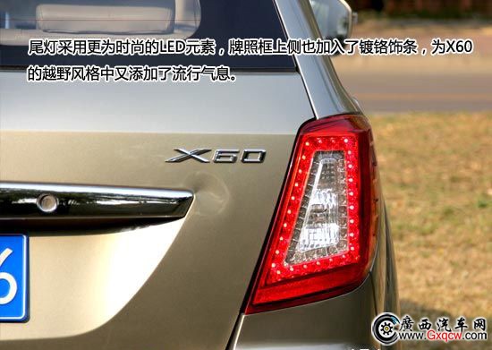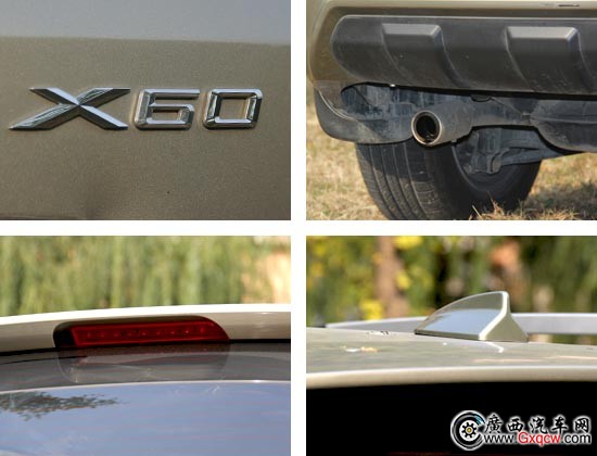 尾燈采用更為時尚的LED元素,牌照框上側(cè)也加入了鍍鉻飾條,為X60的越野風(fēng)格中又添加了流行氣息。排氣管隱藏在后杠下方,使車尾整體性更加。排氣管帶有鍍鉻裝飾,如在精化一下做工,效果會更好。
