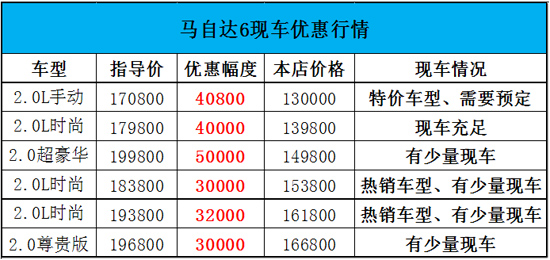 活動(dòng)期間車展優(yōu)惠政策提前享,一汽馬自達(dá)6挑戰(zhàn)2013年價(jià)格極限,決戰(zhàn)B級(jí)車優(yōu)惠巔峰(無需擔(dān)心買貴,簽訂差價(jià)補(bǔ)償協(xié)議),訂購任意車型還可額外獲贈(zèng)3000元精品大禮包;首付達(dá)到50%即可享受12期免息貸款,愛車貸購夢(mèng)想0距離;任意品牌二手車置換享2000元現(xiàn)金補(bǔ)貼,免費(fèi)評(píng)估,高價(jià)回收。