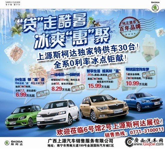 廣西上源斯柯達(dá)攜帶全系車型“貸”走酷暑 冰爽“惠”聚。斯柯達(dá)全系不僅享受車展冰點(diǎn)特價(jià),更尊享全系0利率購車信貸優(yōu)惠,低首付,0利息,德系好車輕松擁有。即日起到廣西上源賞車購車即可獲贈(zèng)第二屆汽車文化節(jié)門票兩張。數(shù)量有限,先到先得。詳詢:0771-3100011