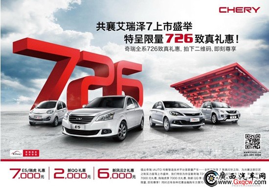 尊享奇瑞7•26致真禮惠:購E5、瑞虎優(yōu)惠7000元、購新QQ優(yōu)惠2000元、購新風(fēng)云2優(yōu)惠6000元!