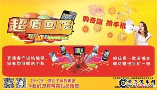 活動期間,奇瑞鑫廣達奇旗艦店展廳,購任意一款奇瑞車,即可贈送手機一部!