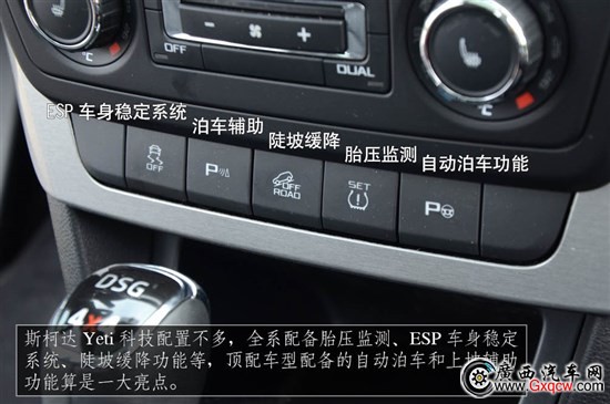 斯柯達(dá)Yeti科技配置并不多,全系配備有胎壓監(jiān)測、ESP車身穩(wěn)定系統(tǒng)、陡坡緩降功能等,頂配車型配備的自動(dòng)泊車和上坡輔助功能算是一大亮點(diǎn)。