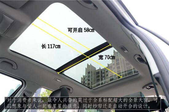 對(duì)于消費(fèi)者來說,最令人興奮的莫過于全系標(biāo)配超大的全景天窗,可以想象與愛人一起看星星的愜意。同時(shí)紗簾還是自動(dòng)開合的設(shè)計(jì)。