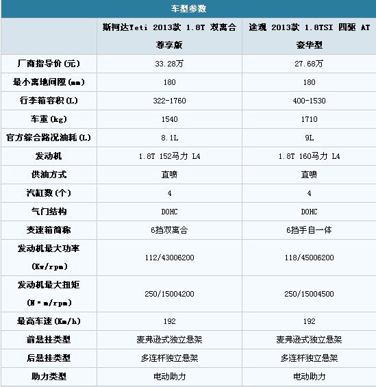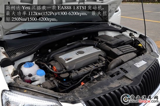 斯柯達(dá)Yeti只搭載一款EA888 1.8TSI發(fā)動(dòng)機(jī),最大功率112kw(152Ps)/4300-6200rpm,最大扭矩250Nm/1500-4200rpm。相比途觀1.8TSI動(dòng)力弱了6kw,不過(guò)油耗卻比途觀低,官方公布的油耗為百公里8.4L,而途觀為9L。