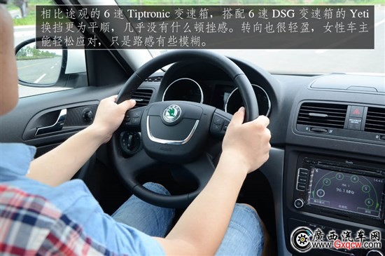 相比途觀的6速Tiptronic變速箱,搭配6速DSG變速箱的Yeti換擋更為平順,幾乎沒(méi)有什么頓挫感。轉(zhuǎn)向也很輕盈,女性車主能輕松應(yīng)對(duì),只是路感有些模糊。