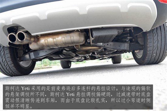 斯柯達(dá)Yeti采用的是前麥弗遜后多連桿的懸掛設(shè)計(jì)。與途觀的偏軟的懸架調(diào)校所不同,斯柯達(dá)Yeti懸掛調(diào)校偏硬朗,過(guò)減速帶時(shí)底盤震動(dòng)很清晰傳遞到車廂,而由于底盤比較扎實(shí),所以過(guò)小彎道時(shí)側(cè)傾并不明顯。