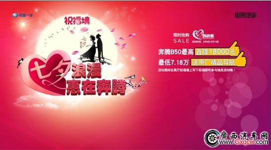 為回饋廣大消費者對奔騰品牌一直以來的支持與厚愛,廣西鉅榮奔騰#浪漫七夕 惠在奔騰#活動開始了,8月9日-8月13日到展廳祝福墻上寫下祝福---大聲說出你的七夕祝福!即可參與抽獎活動!贏取七夕禮品!同時, 8月1日-13日關注鉅榮奔騰官博,轉發(fā)并@三位好友,大聲說出你的七夕祝福!活動結束后我們會隨機抽取幸運博友,贏取七夕禮品。實物禮品:50元移動充值卡一張(1)、水晶相框一個(5)、情侶對杯一套(10)。詳情咨詢:0771-3216008。