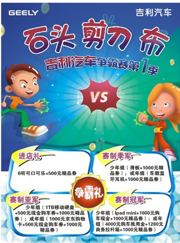 石頭剪刀布吉利汽車爭霸賽第一季進入倒計時3天……吉利夏日派對,各種大禮等你來。