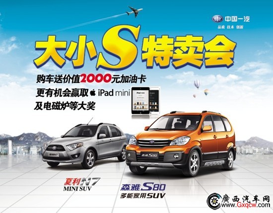 60年積淀,傾情回饋 ——中國一汽輝煌60周年慶多重好禮回饋用戶,中國一汽為了喜迎60周年慶典,將致力以非凡的積淀,打造一場由天津一汽Mini SUV夏利N7和經(jīng)濟(jì)城市SUV典范森雅S80組成的大小SUV車型特賣會回饋盛宴;8月24、25日活動期間除現(xiàn)金方面有較大的優(yōu)惠以為,到店、購車還可享3重好禮回饋: 一重禮:到店即獲精美禮品 ;二重禮:購車可獲2000元油卡 ;三重禮:購任意指定車型有機(jī)會抽得Ipad mini大獎 。