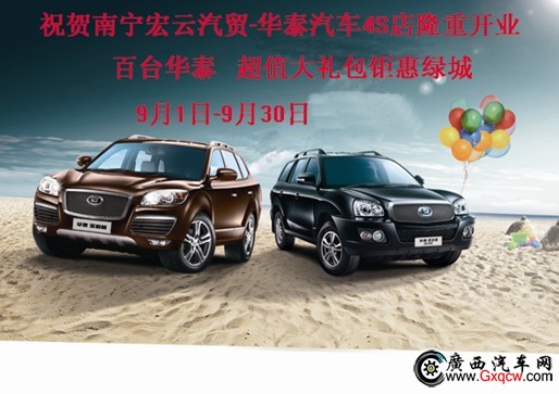 南寧華泰汽車直營店——華泰4S店(南寧市宏云汽車貿(mào)易有限公司)將于9月1日-9月30日隆重開業(yè)!南寧市宏云汽車貿(mào)易有限公司是華泰指定的一級經(jīng)銷商,是集整車銷售、售后維修、配件供應、信息反饋于一體的最高標準華泰4S店,是廣西區(qū)店面面積最大、建設最標準、影響力最大的華泰4S店,公司擁有超大面積的新車展示廳、售后維修區(qū)、客戶休息區(qū)及泊車區(qū)等。各部分功能齊全、設施先進、環(huán)境舒適,為客戶營造出良好的購車、維修環(huán)境,充分體現(xiàn)出公司一貫推崇的“以人為本,用戶至上”的企業(yè)核心價值觀,不斷致力于企業(yè)的經(jīng)營發(fā)展,建立品牌化的“4S”服務中心。