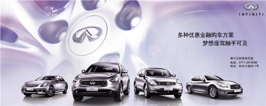 2013年9月13-15日第十一屆北部灣(南寧)車展華麗登陸南寧國際會展中心,南寧元和英菲尼迪與您相約A4展位。英菲尼迪QX50風(fēng)尚運(yùn)動型SUV新款上市,SUV從未如此栩栩如生;英菲尼迪全進(jìn)口G系豪華運(yùn)動座駕車展特惠~32萬 即可擁有,全系四年十萬公里免費(fèi)保養(yǎng),多種優(yōu)惠金融購車方案,夢想座駕觸手可及。夢想,零距離。