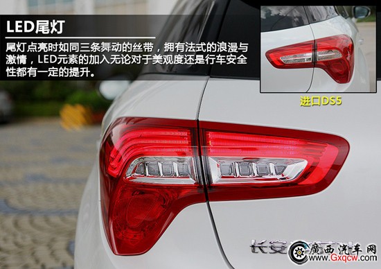 尾燈部分,國產(chǎn)DS5新增加了8顆LED燈,4顆為轉(zhuǎn)向燈,4顆為倒車燈,無論對于美觀度還是行車安全性都有一定的提升。