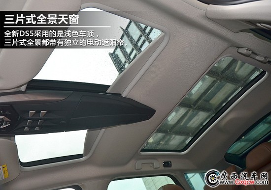 國產(chǎn)DS5延續(xù)了進(jìn)口版的三片式全景天窗的設(shè)計(jì),每一片玻璃都帶有獨(dú)立的電動遮陽簾但不可開啟,另外新車后排頭頂新增加了一個后排遮陽簾開關(guān)。