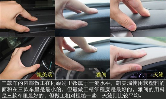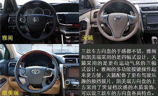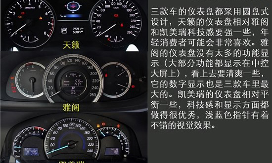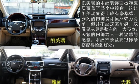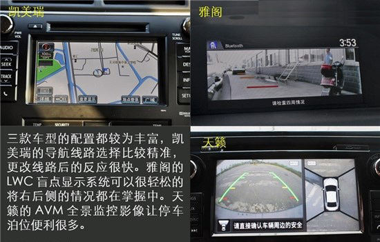 三款車的內飾都很上檔次,配置也各具特點,凱美瑞的導航系統(tǒng)、雅閣的LWC盲點顯示系統(tǒng)、天籟的AVM全景監(jiān)控影像都是各自的殺手锏。