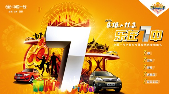 2013年9月16日至11月3日,中國(guó)一汽南寧華馳店推出了“7周、7款車、7種禮、7折秒殺、7彩車生活”讓您樂(lè)在“7”中的特惠購(gòu)車活動(dòng)。這一連串的數(shù)字“7”凝聚了中國(guó)一汽小型車專屬經(jīng)銷店“金秋獻(xiàn)禮”活動(dòng)的豐富內(nèi)涵。此次中國(guó)一汽南寧華馳店匯集旗下森雅S80、M80、夏利N7、歐朗、威志V5、威志V2和 夏利N5共7款精品小型車,借助“金九銀十”銷售旺季,啟動(dòng)樂(lè)在“7”中金秋獻(xiàn)禮活動(dòng),讓客戶再次關(guān)注和體驗(yàn)中國(guó)一汽小型車家族精湛的產(chǎn)品品質(zhì)和技術(shù),并通過(guò)提供超值實(shí)惠的“7種購(gòu)車好禮”,包括2000元油卡的“購(gòu)車禮”、購(gòu)車再中1000元油卡的“抽獎(jiǎng)禮”、“零利率、零月供”的 “信貸禮”、2000元油卡的“置換禮”以及種類繁多的“到店禮”,還有網(wǎng)上3折購(gòu)車的”秒殺禮”及注冊(cè)到店試駕即送的手機(jī)話費(fèi)的“試駕禮”等,讓用戶樂(lè)在“7”中,利用這個(gè)金秋從容去挑選滿足自己需求的心儀座駕,輕輕松松感受一回一汽小型車產(chǎn)品帶來(lái)的“7”彩車生活。