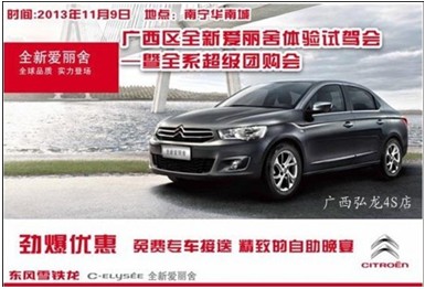 東風(fēng)雪鐵龍將于2013年11月9日南寧華南城舉行“廣西區(qū)全新愛麗舍上市會(huì)暨全系團(tuán)購(gòu)會(huì)”,更有精致茶歇、抽獎(jiǎng)活動(dòng),讓您擁有無以倫比的購(gòu)車體驗(yàn),一起組團(tuán)參加“超級(jí)團(tuán),馬上購(gòu)”!東風(fēng)雪鐵龍全系現(xiàn)車明碼標(biāo)價(jià),誠(chéng)意開賣!