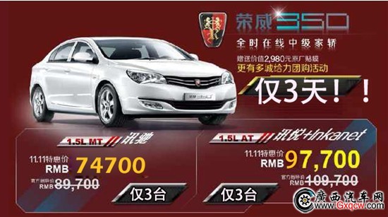11月9日—11日,隨著網(wǎng)絡(luò)購物市場的高速發(fā)展,現(xiàn)在參與網(wǎng)購的人群日益廣泛,而今年榮威聯(lián)合雙十一促銷活動可算為購物狂歡節(jié)的熊熊火焰再添了一把柴火,F(xiàn)在榮威對旗下全新榮威550、350、W5等多款熱門車型進行促銷。