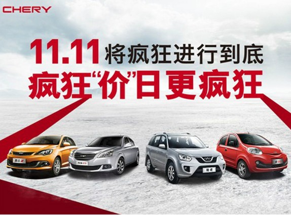 奇瑞汽車邀您約惠單身節(jié)讓利狂潮,為您重磅呈現(xiàn)11.11瘋狂購車節(jié)!QQ、風云2、E5、瑞虎,四款經(jīng)典車型全系鉅惠,在瘋狂“價”日總額高達3億優(yōu)惠基礎上,再度重磅加碼!活動當天購車,任您勁享瘋狂底價!不僅如此,更有巨匠之制艾瑞澤7和實尚家轎E3火熱到店,與您共襄瘋狂盛惠!還有萬眾期待的神秘禮遇,力圖將瘋狂讓利進行到底!一年僅此一次的瘋狂讓利,比瘋狂更瘋狂的“價”日狂歡,您,怎容錯失?!