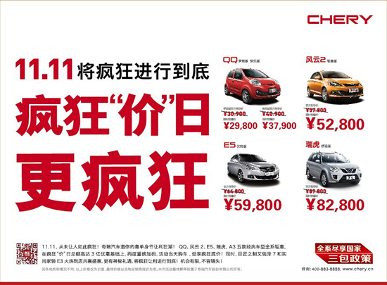 奇瑞汽車邀您約惠單身節(jié)讓利狂潮,為您重磅呈現(xiàn)11.11瘋狂購車節(jié)!QQ、風云2、E5、瑞虎,四款經典車型全系鉅惠,在瘋狂“價”日總額高達3億優(yōu)惠基礎上,再度重磅加碼!活動當天購車,任您勁享瘋狂底價!不僅如此,更有巨匠之制艾瑞澤7和實尚家轎E3火熱到店,與您共襄瘋狂盛惠!還有萬眾期待的神秘禮遇,力圖將瘋狂讓利進行到底!一年僅此一次的瘋狂讓利,比瘋狂更瘋狂的“價”日狂歡,您,怎容錯失?!