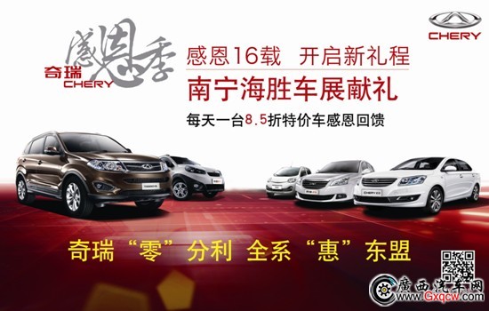 12月5日,2013第六屆中國東盟(南寧)國際汽車展覽會即將拉開帷幕,屆時,南寧海勝攜奇瑞熱銷車型集體亮相。車展期間,為答謝廣大車主對奇瑞汽車的支持,奇瑞廠家舉辦“奇瑞感恩季•全系惠東盟”的大型優(yōu)惠購車活動!