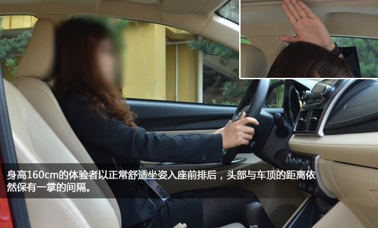 身高160cm的體驗者以正常舒適坐姿入座前排后,頭部與車頂?shù)木嚯x依然保有一掌的間隔;在不移動座椅的前提下,以同樣坐姿入座后排,體驗者可以得到接近兩掌的腿部空間,頭部空間也明顯一拳有余,幾近A級水準。