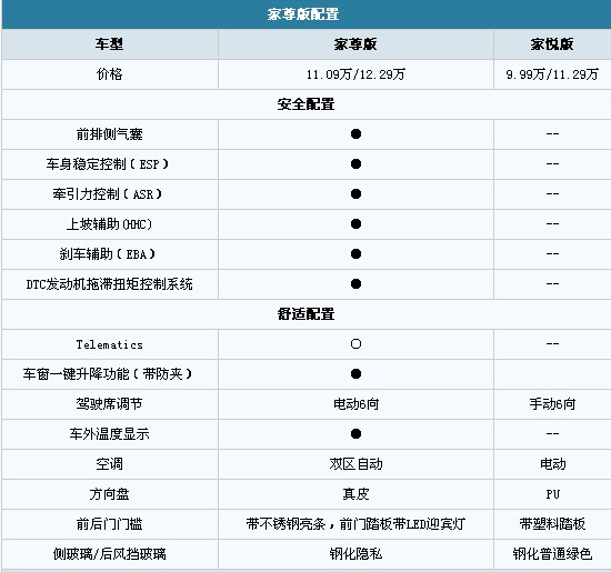 家尊版和家悅版相比,手動擋差價為1.1萬元(機(jī)械液壓助力),自動擋車型差價為1萬元(電子助力),安全性和舒適性兩方面的配置都有提升。安全方面,ESP、ASR以及上坡輔助從家尊版開始配備了;舒適性方面,雙區(qū)自動空調(diào)、真皮方向盤以及駕駛座電動6向調(diào)節(jié)等配置也都一一出現(xiàn)了。單從配置價格上來看,這些配置是1萬或者1.1萬沒辦法買到的。而且,ESP和側(cè)氣囊等都是后期無法自主加裝的,所以花1萬多買這些是很劃得來的。