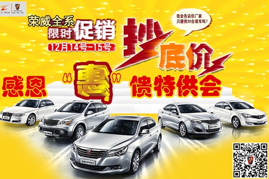 12月14-15日,為慶祝我店在車展訂單期間破百臺,廠家追加20臺特價車回饋客戶。榮威全系車型鉅惠并享超值千元禮包!搶先電話預(yù)約,有驚喜!搶購熱線:400-922-0771轉(zhuǎn)8022