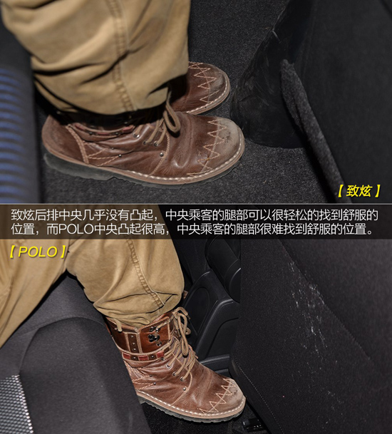 致炫的后排中央幾乎沒(méi)有凸起,中央乘客的腿部可以很輕松的找到舒服的位置,而POLO的中央凸起很高,中央乘客的腿部很難找到舒服的位置。除此之外,致炫的后排配備了中央頭枕,而POLO沒(méi)有配備,中央乘客的舒適性方面,POLO遠(yuǎn)不如致炫。