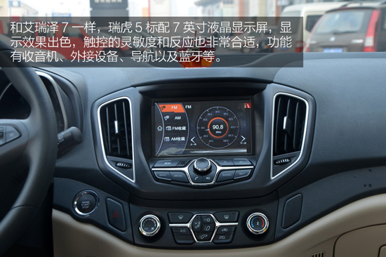 瑞虎5的配置水平不低,標配7英寸液晶顯示屏,顯示效果出色,觸控的靈敏度和反應(yīng)也非常合適,功能有收音機、外接設(shè)備、導(dǎo)航以及藍牙等,操作方便,同時還標配倒車視頻影像功能。