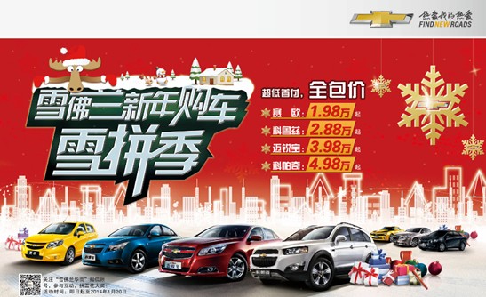 即日起至2014年1月20日,雪佛蘭“雪拼季”推出“車價+買車購置稅+保險費+上牌費”等費用一次全打包,購車超低首付只要4.98萬,“七座大空間”科帕奇隨時跟你走。此外,雪佛蘭還聯(lián)手騰訊開發(fā)“砸雪球”微信游戲,為準備在年末購車的小伙伴再添優(yōu)惠驚喜。