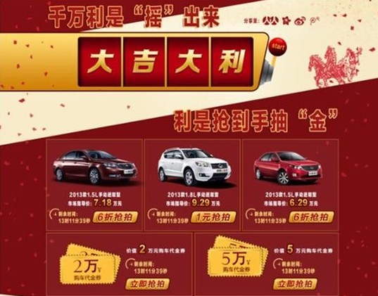 除夕前夕打長途給爸媽,別在發(fā)愁電話費(fèi)啦,吉利精彩利是多多送,千萬利是“搖”出來。你一定有玩過不少次街頭拉霸機(jī)的經(jīng)驗(yàn)吧,你是搖獎控嗎?你的搖獎運(yùn)扶搖直上嗎?那快來吉利千萬利是“搖”出來的活動平臺大顯身手吧,吉利近10萬利獎品傾情大放送,搖一搖即可擁有獲獎機(jī)會——活動期間,凡登錄活動平臺,注冊并輸入個人訊息,即可獲得線上線下兩重利是的獲獎途徑:收到注冊成功的確認(rèn)短信后,網(wǎng)友可以首先在平臺通過模擬搖獎機(jī)進(jìn)行幸運(yùn)抽獎,搖出指定的圖案和字,網(wǎng)友將會有機(jī)會獲得50-500元面值手機(jī)充值卡,還有最高獎金達(dá)1000萬元的雙色球彩票為你在新春前送來多彩好運(yùn),也許下一秒你就躋身千萬富翁行列啦;同時,網(wǎng)友在注冊確認(rèn)短信中還能作為憑證,可在線下指定區(qū)域任一4S店中領(lǐng)取到店利是禮品。