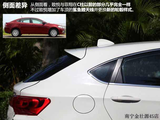 車身側(cè)面,它們運用了同樣的腰線設(shè)計,幾乎相同的車頂線條,在C柱之前它們倆確實一模一樣。說實話,菲翔延伸至后尾箱,略微翹起的線條倒是更顯優(yōu)雅。作為彌補,致悅更換了新的輪轂樣式和鯊魚鰭天線。