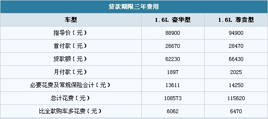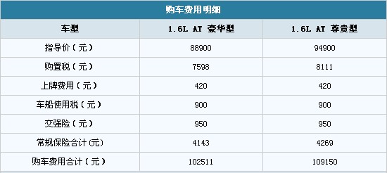 首先我們來(lái)看看全款購(gòu)車需要多少費(fèi)用。以推薦的1.6L AT 豪華型和1.6L AT 尊貴型為例,購(gòu)車費(fèi)用明細(xì)如下: