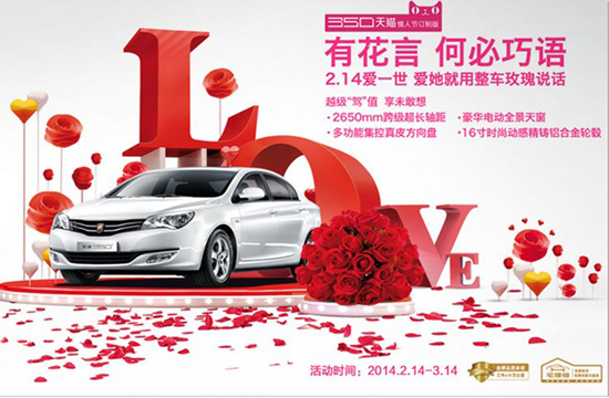 有花言,何必巧語,2.14愛一世,愛她就用整車玫瑰說話,2014年2月14-16日 ,廣西弘威汽車銷售服務(wù)有限公司將在展廳舉行“榮威“愛一世”情人節(jié)活動”。,活動期間尊享八重大禮,再也不用擔(dān)心錢不夠,最低1.8萬即可貸走榮威350,再也不用擔(dān)心W5的購置稅,情人節(jié)幫你免了,更多鉅惠盡在2014年2月14-16日,活動詳情如下,咨詢熱線:3329966