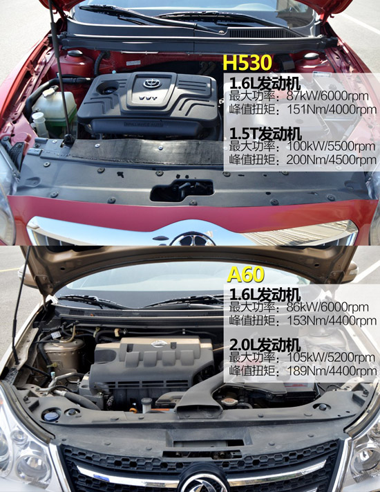H530搭載的是1.6L自然吸氣和1.5T渦輪增壓發(fā)動機,而A60搭載的是1.6L和2.0L兩款自然吸氣發(fā)動機,動力參數(shù)上,1.6L車型的比較中,H530的最大功率高于A60,但峰值扭矩不如A60,而H530的1.5T發(fā)動機與A60的2.0L發(fā)動機比較的結(jié)果正好想反,H530的最大功率不如A60,峰值扭矩優(yōu)于A60。不過要比較發(fā)動機的知名度和品質(zhì),A60要遠優(yōu)于H530,因為A60的發(fā)動機來自日產(chǎn),打開發(fā)動機蓋,“NISSAN”LOGO清晰可見,而H530的自然吸氣發(fā)動機是三菱的落后技術(shù),渦輪增壓發(fā)動機則是自主研制,各方面都遜色于A60。