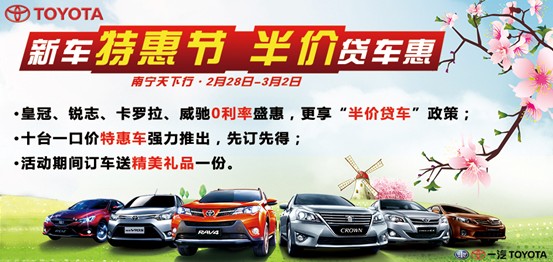 三月春意濃濃,萬物復蘇,正是踏青的好時機。南寧天下行豐田2月28日至3月2日為您帶來半價貸車驚喜,0利率低月供讓您購車出游無壓力。