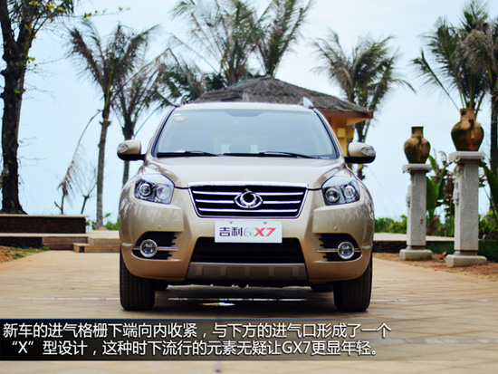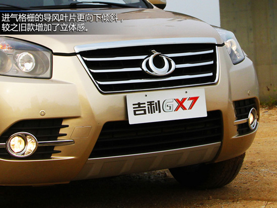 2014款吉利GX7整車造型更加符合潮流,新車的進氣格柵下端向內收緊,與下方的進氣口形成了一個“X”型設計,這種時下流行的元素無疑讓GX7更顯年輕。而前霧燈周圍加入了鍍鉻修飾,也為新車前臉平添幾分時尚元素。經過這些不大不小的修改,GX7幾乎已經脫離了豐田第三代RAV4的影子,讓人耳目一新。