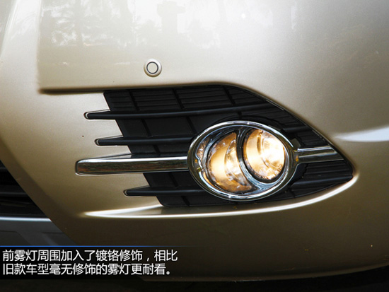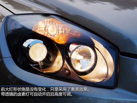 進氣格柵的導風葉片更向下傾斜,較之舊款增加了立體感。前霧燈周圍加入了鍍鉻修飾,相比舊款車型毫無修飾的霧燈更耐看。很多吉利GX7用戶購車后第一要做的裝飾就是去增加個銀色的保險杠下護板,而2014款車型終于原廠配備了。前大燈形狀倒是沒有變化,只是采用了熏黑效果。帶透鏡的鹵素燈可自動開啟且高度可調。