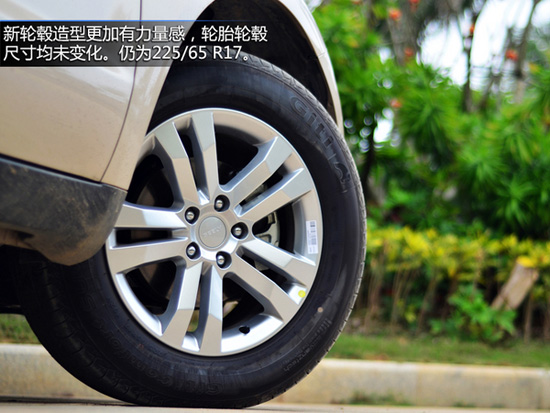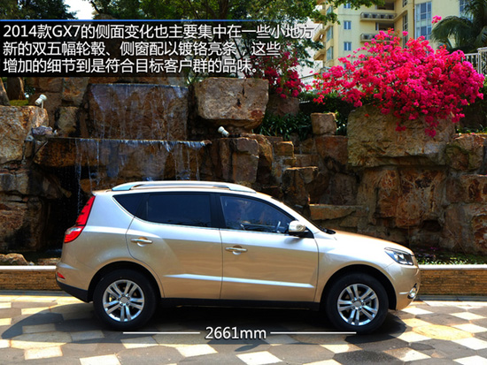 2014款GX7的車身尺寸與舊款沒有變化,仍是4541/1833/1700mm,軸距為2661mm。側面變化也主要集中在一些小地方,新的雙五幅輪轂、側窗配以鍍鉻亮條,這些增加的細節(jié)到是符合目標客戶群的品味。新輪轂造型更加有力量感,輪胎輪轂尺寸均未變化。仍為225/65 R17。