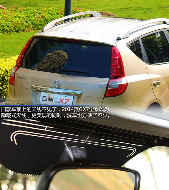 相對于車頭的造型變化,2014款GX7在尾部的改動與老款車型相比不是很大。整體造型沒有改變,但新車增加了一組LED立柱尾燈組,將舊款車后風擋兩側的黑色區(qū)域有效利用。加大的尾燈組提升了安全性,也使得新車尾部給人比老款更加大方沉穩(wěn)。舊款車頂上的天線不見了,2014款GX7全系改為隱藏式天線,更美觀的同時,洗車也方便了不少。