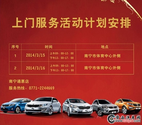東風(fēng)悅達(dá)起亞南寧通惠4S店為回饋廣大新老用戶,為消費(fèi)者帶去實(shí)實(shí)在在的便利與溫情,特別開展春季上門服務(wù),在馬年的春天,以用心、專心的溫情服務(wù),為您帶來新一年的一份感動。暖暖濃情,給您送上家人般的關(guān)懷。東風(fēng)悅達(dá)起亞南寧通惠4S店定于3月15、16日開展上門服務(wù)活動,開展地點(diǎn):南寧市體育中心外側(cè)。詳詢:400-922-0771 轉(zhuǎn)8128