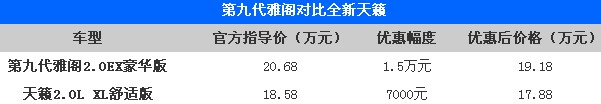 從公平角度兼顧2.0L中配的原則,我們選擇了雅閣2014款 2.0L EX 豪華版和天籟2013款 2.0L XL舒適版, 指導(dǎo)售價分別為20.68萬元和18.58萬元。盡管兩車存在2.1萬元售價區(qū)別,但雅閣目前擁有1.5萬元左右優(yōu)惠,而天籟則有7000元的讓利,綜合來看,已經(jīng)比較接近了。至于具體行情,請消費者聯(lián)系當(dāng)?shù)亟?jīng)銷商確認(rèn)。