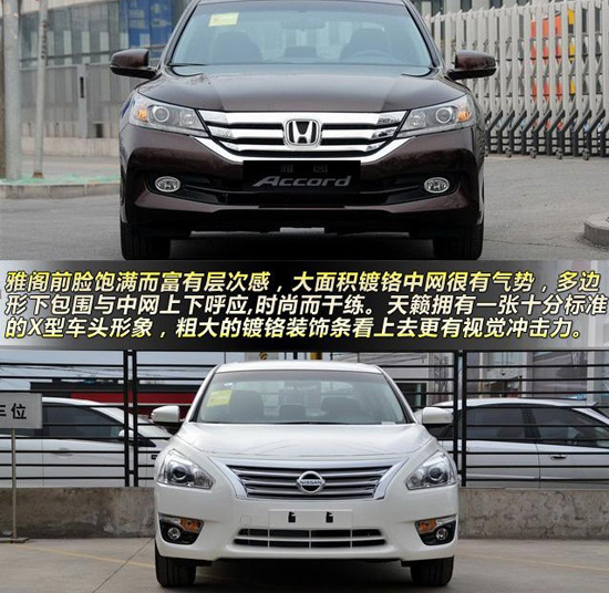 由于每個人的審美情趣和喜好不同,所以這個對比不存在高低區(qū)分,只是說明他們都是全新一代車型,并非小改款。另外,不管是雅閣還是新天籟,從車頭方面就可以看出具有明顯的家族特征,這讓他們的外形對比可以延伸到個體對于品牌的認可。