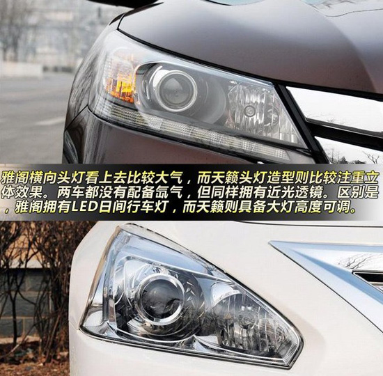 頭燈方面,雅閣橫向頭燈看上去比較大氣,而天籟頭燈造型則比較注重立體效果。兩車都沒有配備氙氣光源,但都配備了近光透鏡,基本照明齊全,不同的是雅閣擁有LED日間行車燈,而天籟則具備大燈高度可調(diào),可以說是棋逢對手。