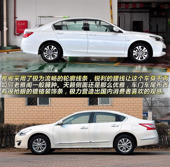 車身側面,雅閣采用了極為流暢的輪廓線條,銳利的腰線讓這個車身不再如同老雅閣一般臃腫,顯得更加時尚緊湊,雖然這會減少一些所謂大氣成分,但也符合時代潮流。天籟側面還是那么優(yōu)雅,車門車尾布置有很搶眼的鍍鉻裝飾條,極力營造出這個級別國內(nèi)消費者喜歡的觀感。