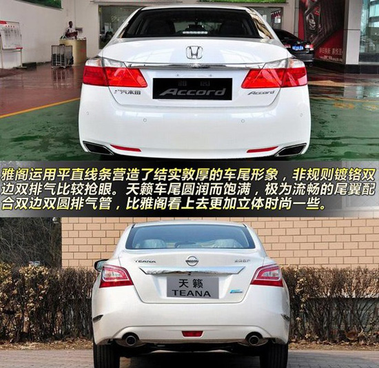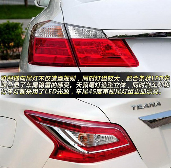 尾燈方面,雅閣橫向尾燈不僅造型規(guī)則,同時燈組面積較大,配合條狀LED光源凸顯了車尾穩(wěn)重的感受。天籟尾燈造型立體,同時剎車燈和行車燈都采用了LED光源,點亮后十分漂亮。從車尾45度審視尾燈,我們發(fā)現(xiàn)其遠比后方90度視覺更漂亮。