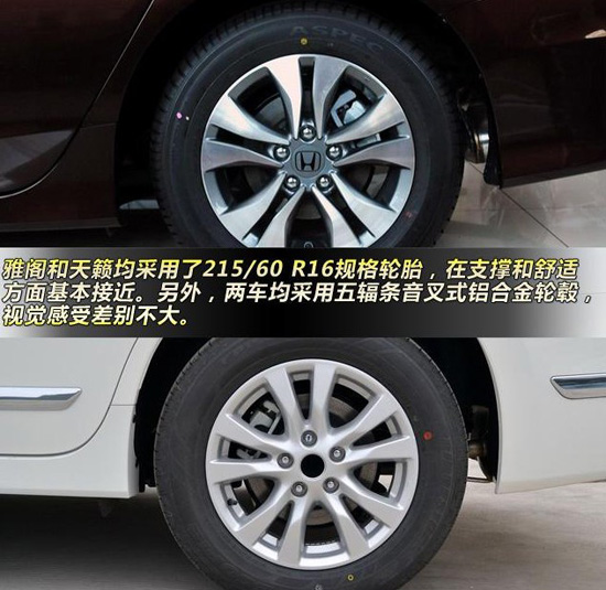車輪方面,雅閣和天籟均采用了215/60 R16規(guī)格輪胎,在支撐和舒適方面基本接近,對于噪音控制以及油耗經(jīng)濟性控制顯然讓兩車在輪胎規(guī)格上達成了一致性。另外,兩車均采用五輻條音叉式鋁合金輪轂,視覺感受差別不大。