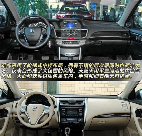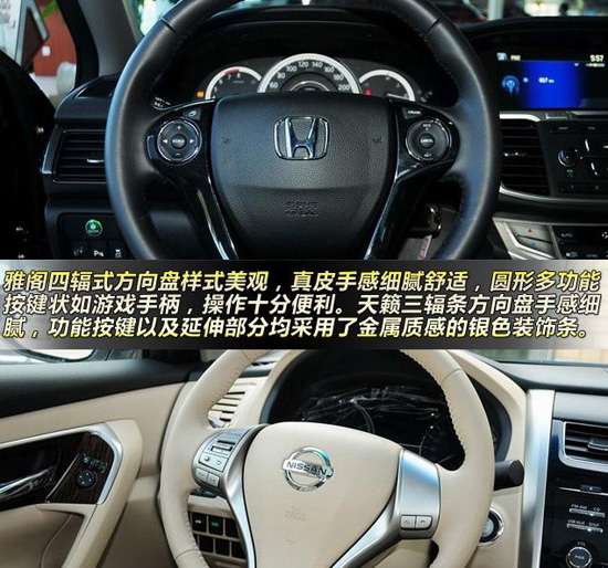 方向盤(pán)方面,雅閣四輻式方向盤(pán)樣式美觀,真皮手感細(xì)膩舒適,圓形多功能按鍵狀如游戲手柄,操作十分便利。天籟三輻條方向盤(pán)手感細(xì)膩,功能按鍵以及延伸部分均采用了銀色裝飾條,不但看上去層次分明,也帶來(lái)了一些金屬質(zhì)感。